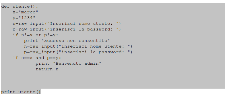 nel codice ho aggiunto il return n perchè altrimenti mi stampava un None che non vorrei si vedesse non so se sono stato chiaro scusate ma sono un novellino def utente(): x="marco" y="1234" n=raw_input("Inserisci nome utente: ") p=raw_input("inserisci la password: ") if n!=x or p!=y: print "accesso non consentito" n=raw_input("Inserisci nome utente: ") p=raw_input("inserisci la password: ") if n==x and p==y: print "Benvenuto admin" return n print utente() --- Ultima modifica di mac21 in data 2017-01-20 16:47:11 --- |