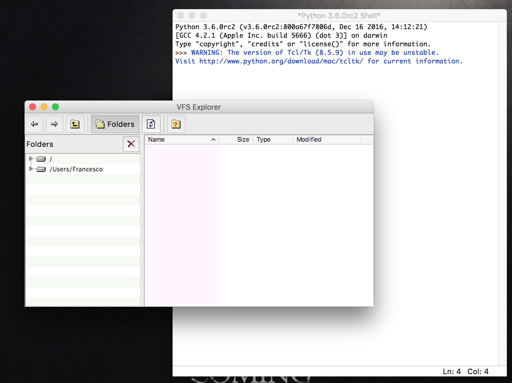 Purtroppo non posso aiutarti, non ho la risposta alla tua domanda non usando Mac, ma ti posso dire di non impazzire troppo per IDLE e di usare tranquillamente anche altri editor/IDE per sviluppare i primi script. Lo strumento che usi deve essere appunto uno strumento e non deve "permettersi" di bloccarti nell'apprendimento del linguaggio. Per mia curiosità, che guida stai seguendo? Cya |
