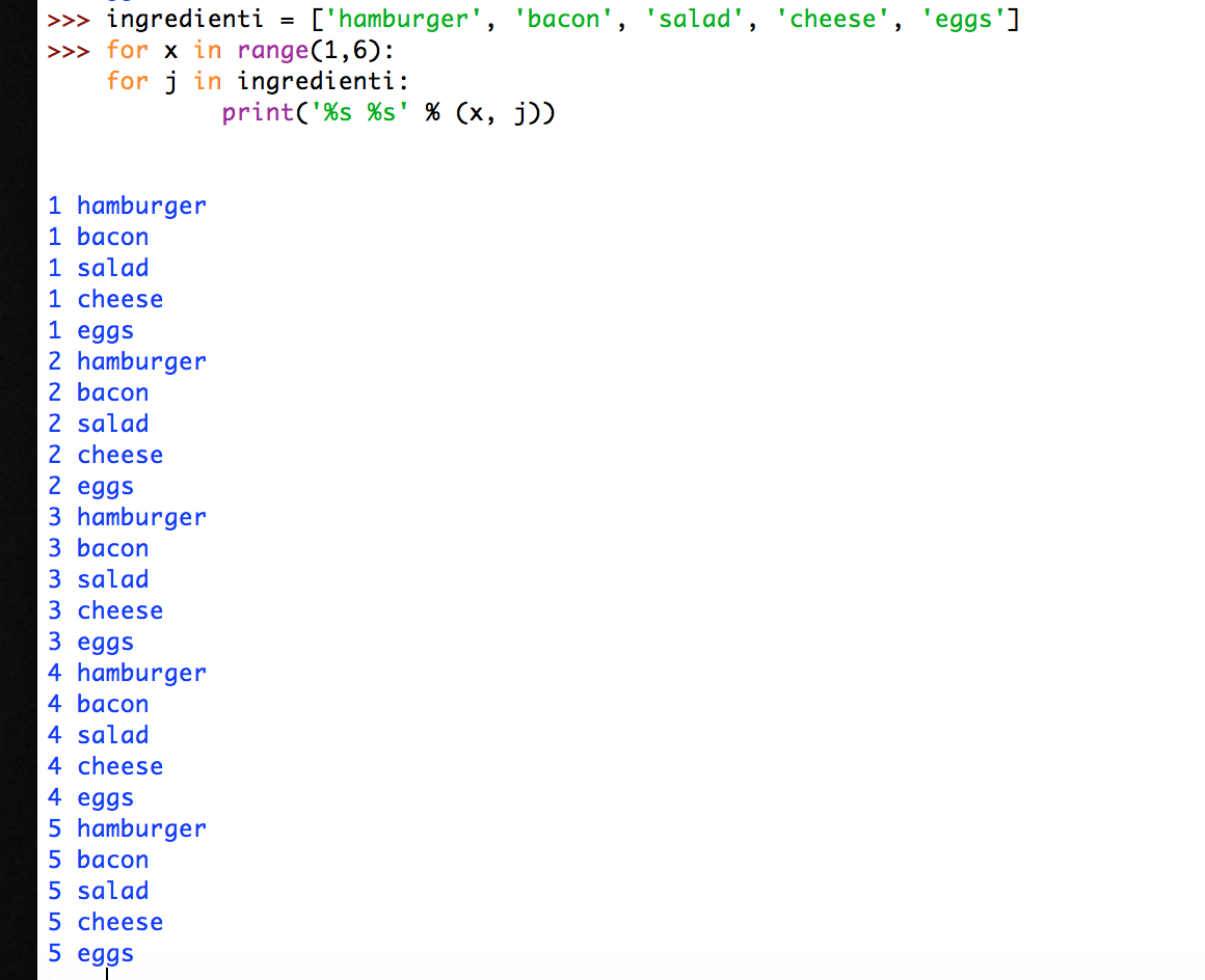 >>> ingredienti = ['hamburger', 'bacon', 'salad', 'cheese', 'eggs']