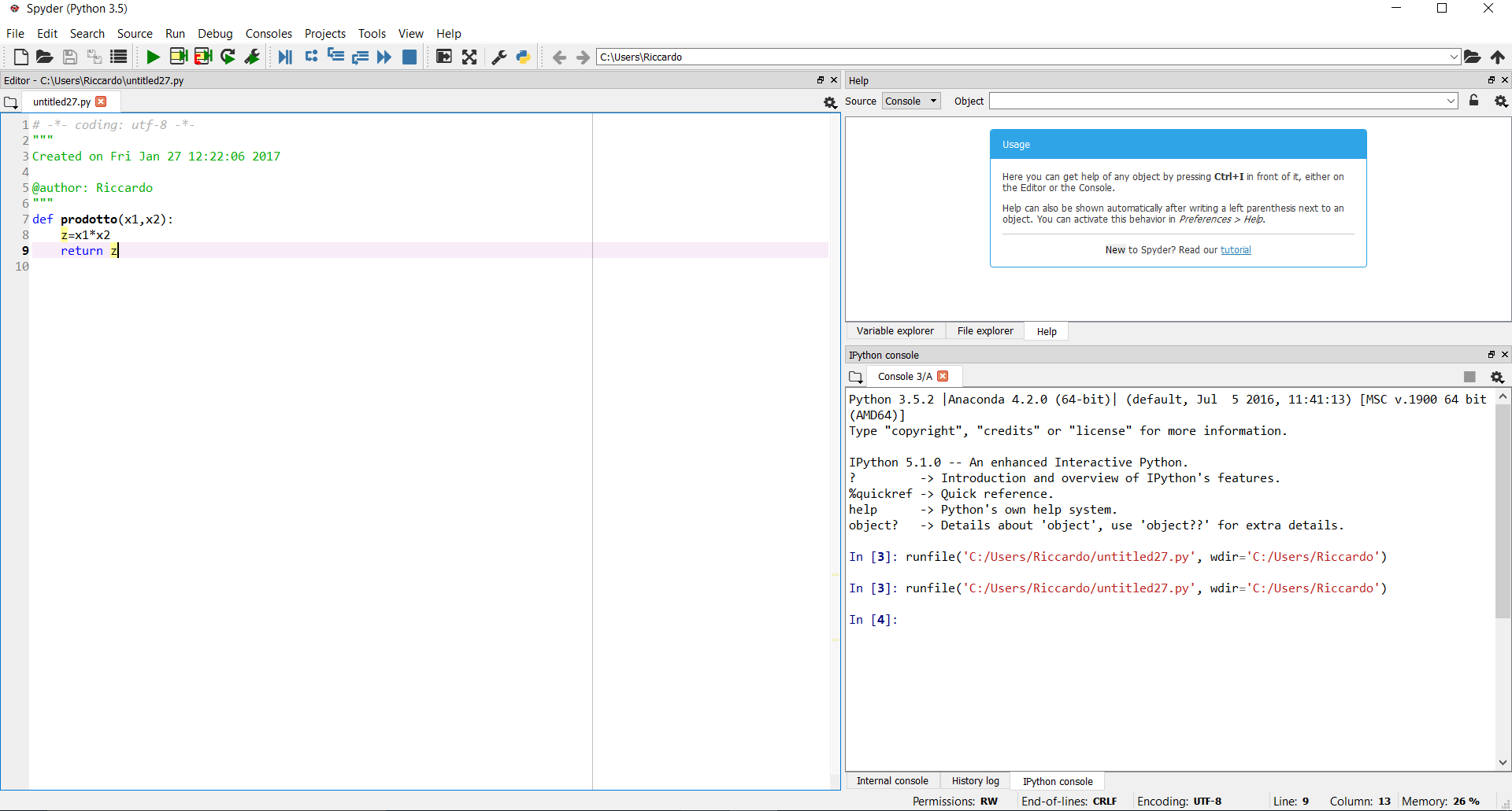 Salve ragazzi, ho bisogno di aiuto quando creo una funzione def prodotto e poi voglio che mi ritorni il prodotto con il comando "return" mi dice sempre "runfile" il programma non ha nessun errore di scrittura o di indentatura. Aiutatemi. Vi allego la foto