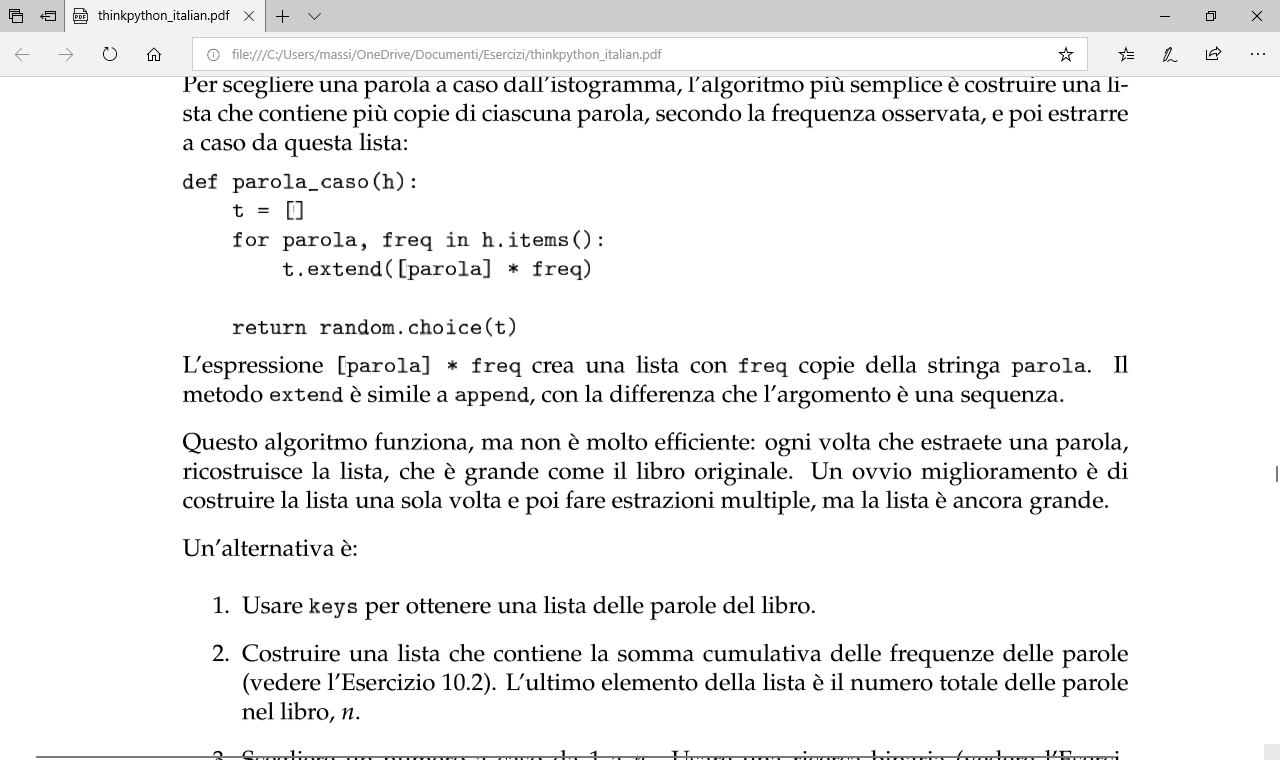 L'autore ti sta spiegando che in quel codice ricrei sempre la lista, mentre potresti creare una sola lista, una volta sola, e poi effettuare le varie estrazioni, alternativamente creando delle liste dove mettere parole ed occorrenze (usando lista.append() magari) e poi eseguire tutte le tue operazioni. Sì perché la lista, specie con fonti molto ampie, è troppo grande e del tutto inefficiente, sarebbe meglio sintetizzare i dati magari in sole due liste. Arrivato a questo punto del libro hai tutto il bagaglio tecnico per eseguire questo tipo di operazioni (ho verificato prima di scrivertelo). Andando un po' avanti nella stessa sezione, ti suggerisce di modificare il dizionario, utilizzando chiavi e valori in modo intelligente, anzi lo definirei più appropriato. Insomma inizia a costruire qualcosa, possiamo ragionarci sopra se non ti riesce, anche se sono sicuro che con un po' di prove ci riesci senza grossi problemi. Cya |