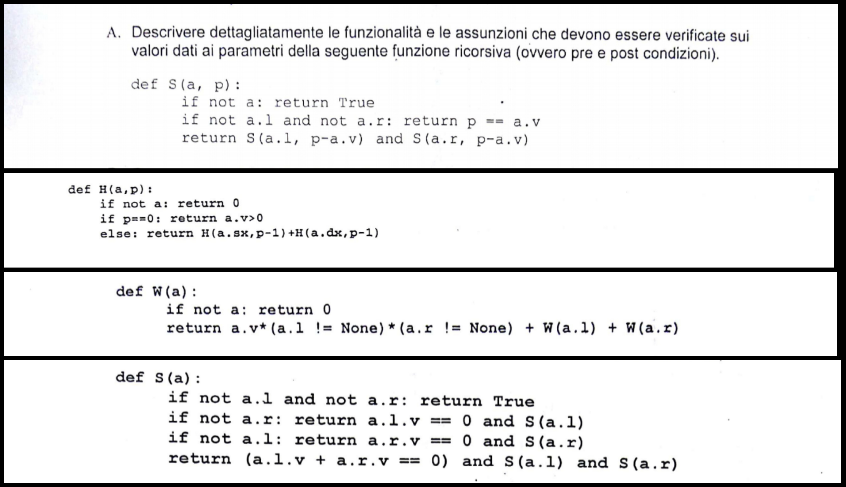 Salve, a breve ho l'esame di programmazione in Python (non frequento la facoltà di matematica, quindi non è troppo profondo), ma non riesco a fornire le post condizioni di queste 4 funzioni ricorsive. Ho intuito che il parametro "a" rappresenta un albero e "a.v" il valore di un nodo e "a.dx" e "a.sx" i rami destro e sinistro.