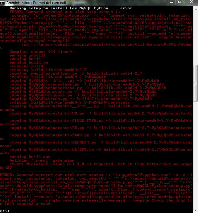 Stai usando python 2.7. Non usare Python 2.7. Tutto ciò che riguarda Python 2.7 è definitivamente da cestinare. Non capisco perché ci sono ancora principianti che partono da Python 2.7... da qualche parte ci dev'essere qualche... non so, un tutorial su youtube, qualcosa di malvagio e oscuro che ancora inganna la gente... Ma non riesco a capire dov'è... puoi dirmi quale risorsa ti ha suggerito di installare Python 2.7, così magari la aggiungiamo alla lista nera? Poi stai usando mysql-python, che è una libreria vecchia, non aggiornata da anni. Ma davvero, bisognerebbe darci un'occhiata, alle cose che si usano, prima di usarle. Il motivo per cui hai quell'errore è che il package non è pre-compilato... perché ovviamente un pacchetto vecchio di anni e mai più aggiornato non è certo distribuito con delle wheel precompilate... Dando un'occhiata su PyPI vedo che è disponibile un installer .exe, https://pypi.org/project/MySQL-python/#files come ai bei tempi negli anni '90... se sei fermamente intenzionato a fare retro-computing, dovresti provare a scaricare e usare quello. Se invece sei interessato a Python, disinstalla Python 2.7, procurati una versione recente (l'ultima è la 3. 8 e segui un buon libro passo-passo. Per i problemi specifici di installazione e ambiente di esecuzione su windows, la mia guida (link in firma) resta una buona idea. --- Ultima modifica di RicPol in data 2019-12-15 14:04:18 --- https://pythoninwindows.blogspot.com/p/i-miei-libri.html : i miei libri