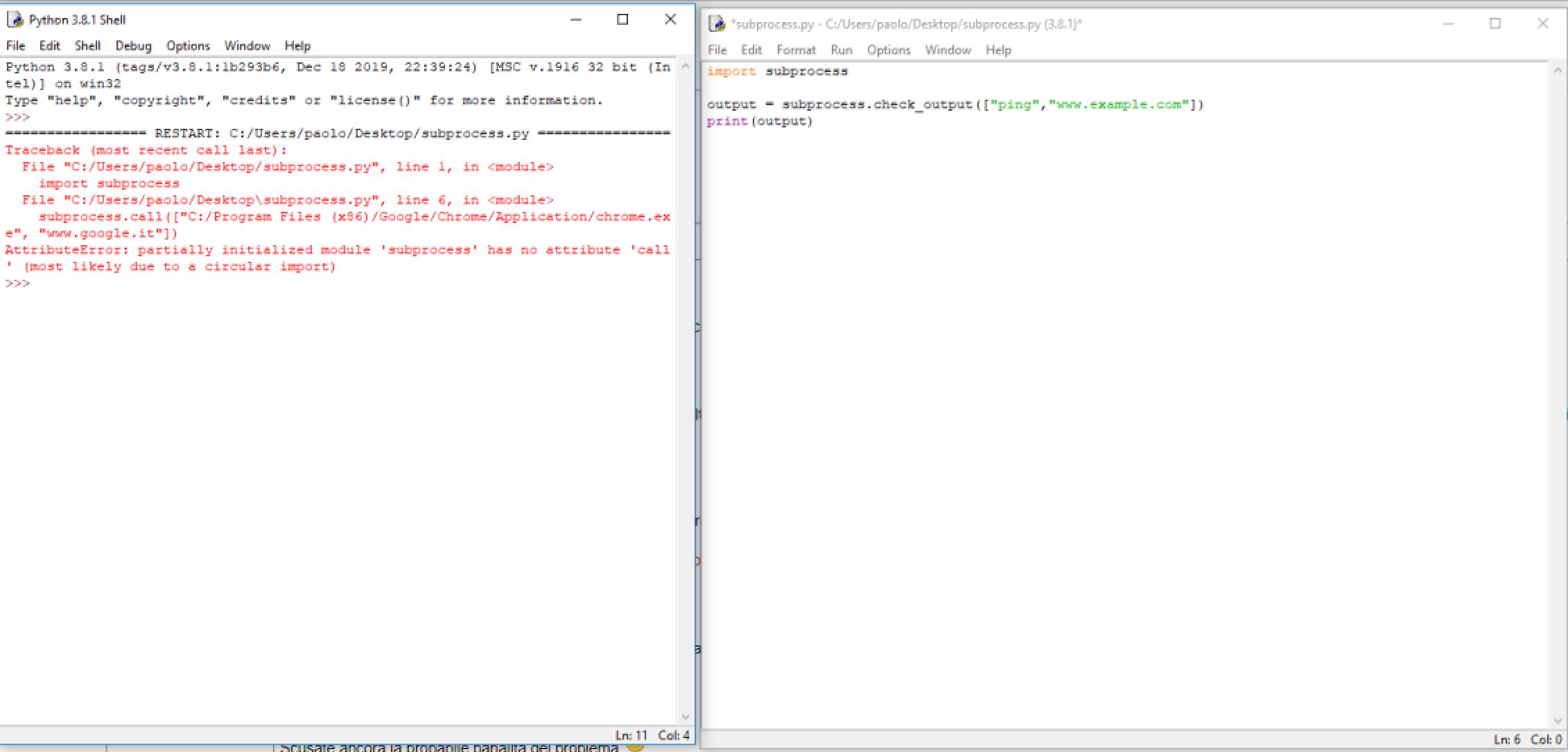 Scusa ma mi stai prendendo in giro? Avevo detto: avrai chiamato il tuo file subprocess.py.... Nooooo, figurati.... è un file "intitolato" moduli.py! E invece eccolo lì, bello come il sole, nella schermata: "C:/Users/paolo/Desktop/subprocess.py"... ora A ME questo sembra PROPRIO un tuo file che si chiama subprocess.py, VERO?