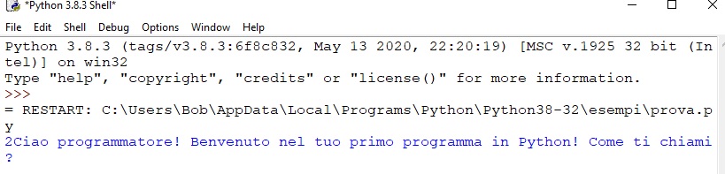 Sto seguendo le varie guide sul sito e ora, dopo aver letto sto mettendo in pratica le conoscenze di base. Sono sotto WIN e ho installato la versione 3.8.3. Tutto funziona perfettamente ma quando creo un nuovo file, anche con due righe di comando, e poi provo ad eseguirlo, tutto ok ma come prima riga, mi viene mostrato il percorso del file che in precedenza ho salvato: = RESTART: C:/Users/Bob/AppData/Local/Programs/Python/Python38-32/esempi/prova.py Si può eliminare questa riga? è un pò fastidiosa e poi negli esempi che sto seguendo questa riga nn compare mai. Grazie ... a presto ... vi disturberò ancora --- Ultima modifica di roby8a roby8a in data 2020-06-02 14:29:01 --- Roberto |