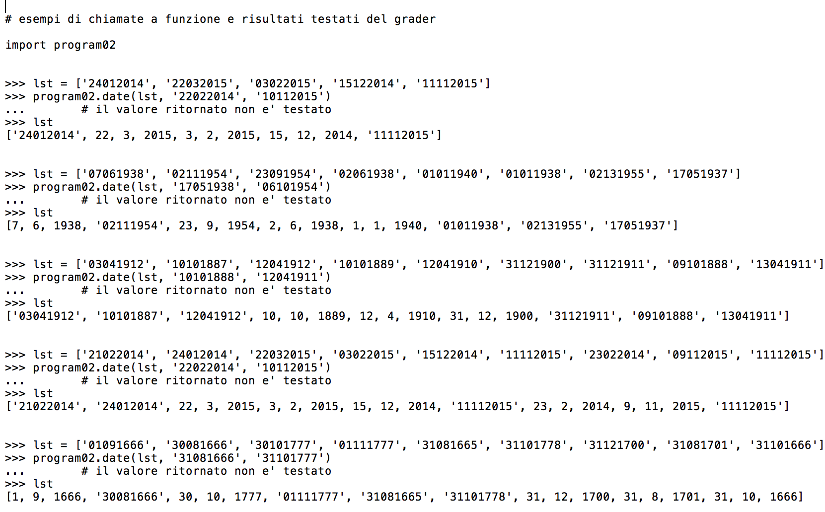 Nel codice che proponi commetti un errore di fondo o in fondo se preferisci. Quelle che stai trattando sono date e non semplici numeri. Quando applichi lo slice analizzando i singoli oggetti, non potrai ottenere mai il risultato sperato. Finché confronti anni e mesi non ci sono grossi problemi, ma quando poi vai al giorno iniziano le incongruenze. Se tu hai una data come la seconda nella lista, 22032015, che dovrebbe arrivare fino in fondo nei tuoi vari cicli if per essere scomposta come richiesto dall'esercizio perché maggiore di d1 ma minore di d2, col tuo codice non otterrai il risultato sperato. Quando scrivi x[0:2] >= d1[0:2] e x[0:2] <= d2[0:2] nascono i problemi, perché nella sua interezza il 22032015 è minore del 10112015, ma ovviamente dopo l'operazione di slicing il 22 non sarà mai minore o uguale a 10. Esistono diverse soluzioni per risolvere il problema come introdurre alcuni and nel tuo codice, oppure trattare la stringa come una data. Con un codice simile a quello sotto ottieni esattamente quanto vuoi, ma ti invito a capirlo e a fare le opportune verifiche ed approfondimenti, altrimenti il tuo professore ti scopre subito se ti chiede di spiegargli il funzionamento ed, a ragione, s'incazza pure. Ma anche se non si incazzasse nessuno, non ha senso copiare l'esercizio senza capirlo, non è lo scopo per cui stai studiando. # Oggetti iniziali
